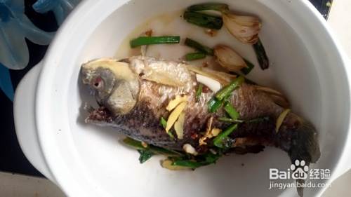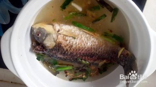 大火炖约20分钟,用筷子扎一下鱼肉,已经很软了,就可以把葱段、姜片捞出,撒上一点碧绿的小葱花,就可以开吃了。