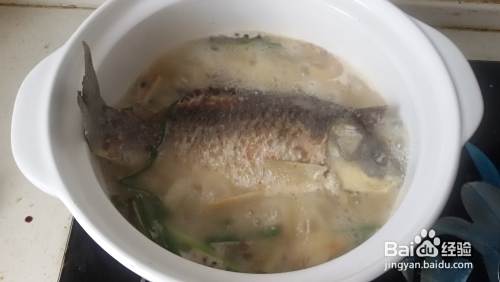 炖鱼汤开锅后一定要用大火才能炖出奶白奶白的汤,如果改成小火炖出来的汤就是清汤。因为这次加入了味极鲜汤色有点发黄影响视觉,可以加少许鸡精代替味极鲜。