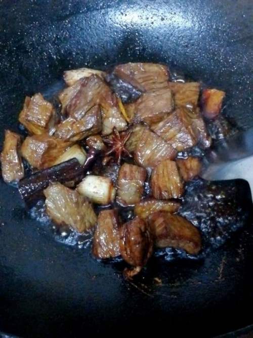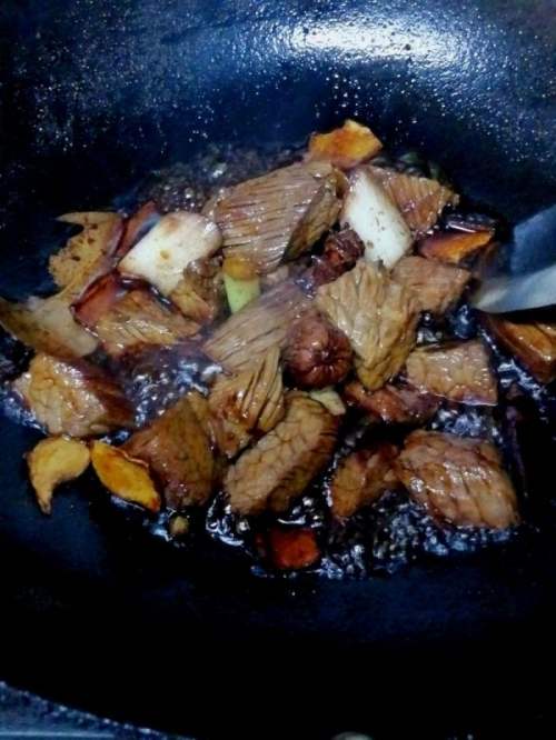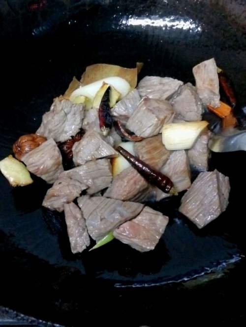 6起锅烧油,加入各种干调料炒香,然后放入切成小块的牛肉煸炒一下…