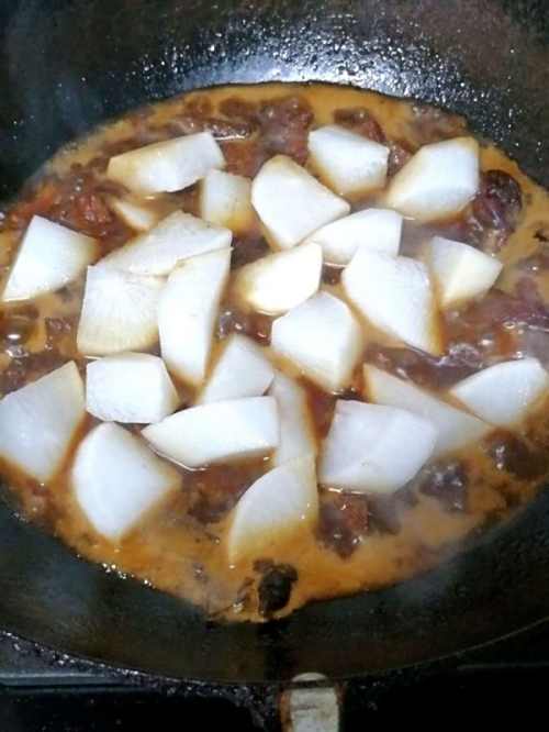 12待牛肉已熟,再加上白萝卜块炖煮约十分钟,再调一下味,最后加入咖喱粉,待充分溶解并呈红黄色略有收汁即可装盘。