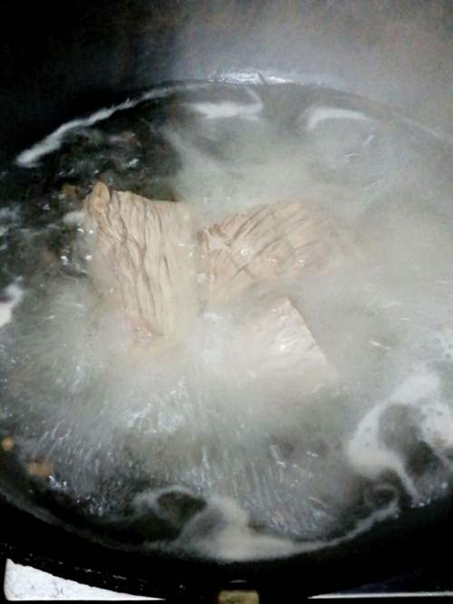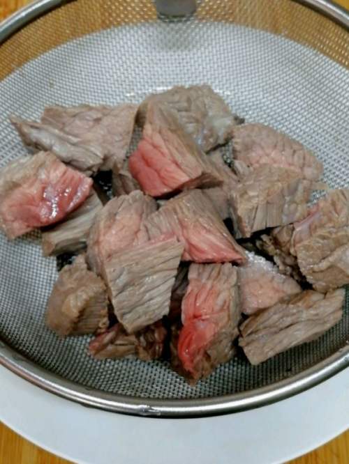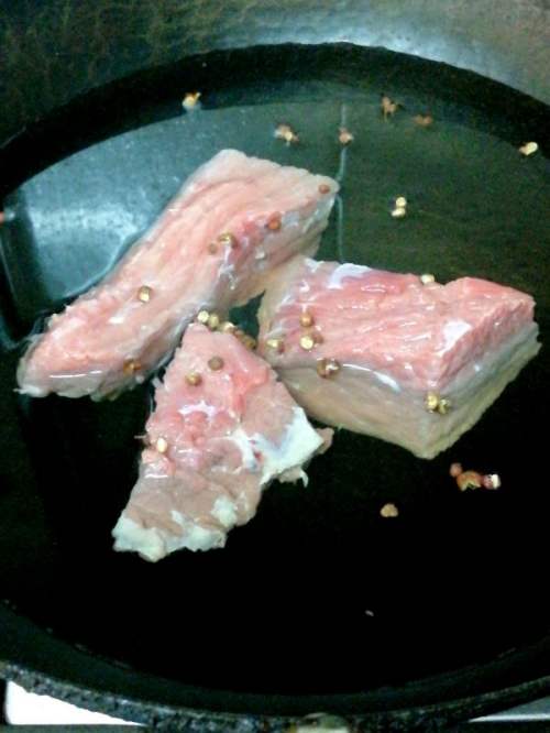2起锅坐水,牛肉改刀切块放入锅中,加料酒、花椒,大火烧开后再煮5分钟,以充分去除血水。
