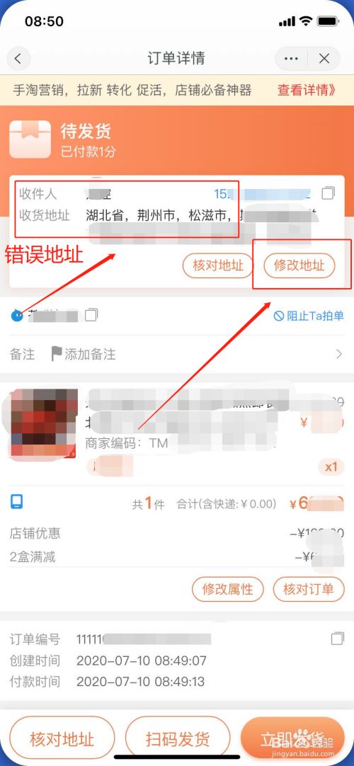 打开的客户订单信息以后,可以看到客户的原本地址,“湖北省荆州市松滋市xxx”,点击下列“修改地址”