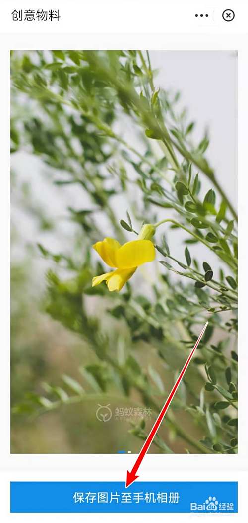 打开柠条树图文页面,滑倒最后,有一张手机图片,选择它,打开创意物料页面,选择保存图片至手机相册下载到手机上;