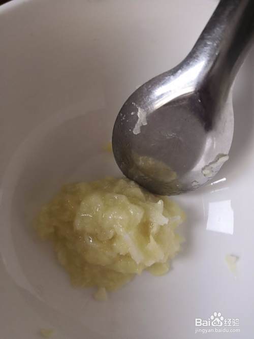 将蒜瓣去皮,放到蒜窝中,捣成蒜泥,蒜泥挖到碗中,备用。
