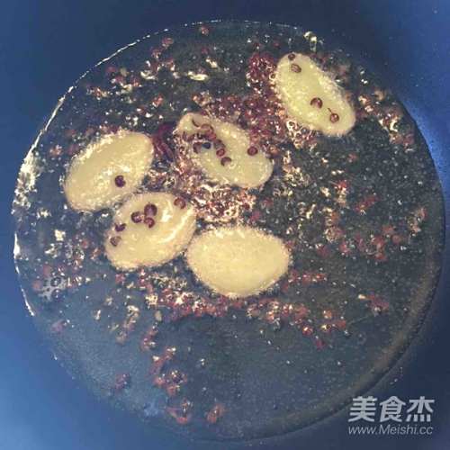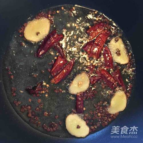 3食用油入锅烧热,放入生姜片、花椒、八角茴香炸香