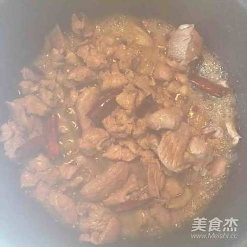 4炸香后放入干辣椒(干辣椒一下锅,羊肉就立马倒入,因为油锅热不要让辣椒焦了,烧焦了黑黑的不好看)