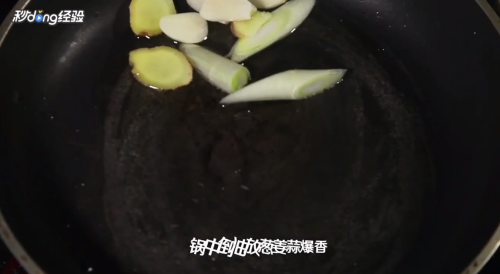 锅中倒油放葱、姜、蒜爆香,放入猪腰爆炒。