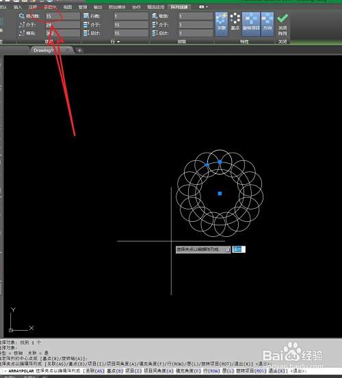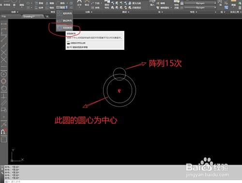 4.用【环形阵列】命令,以R10的圆心为中心,把小圆阵列15次,如图