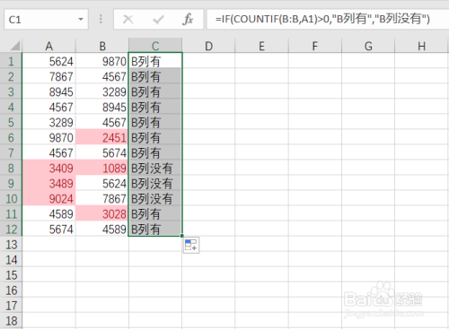 然后在C1单元格输入公式“=IF(COUNTIF(B:B,A1)>0,"B列有","B列没有")”,按下回车