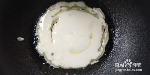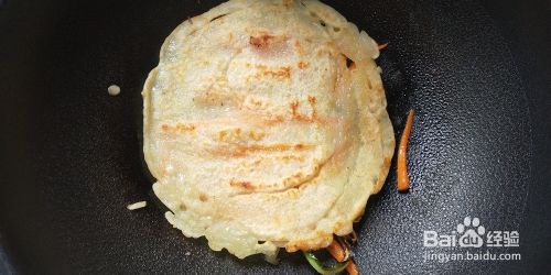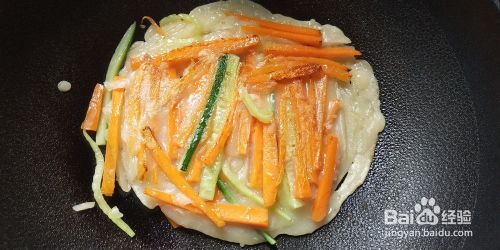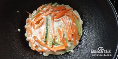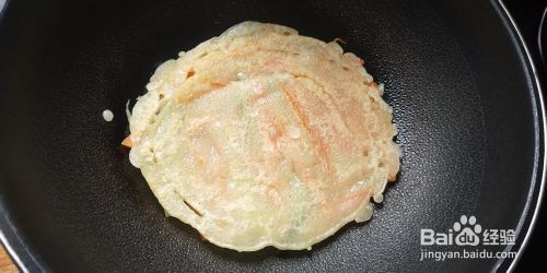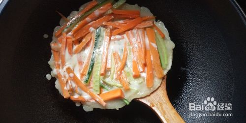 热锅热油,倒入面浆,转小火迅速加入胡萝卜黄瓜条,用锅铲压平,撒入一些盐。待底部煎至金黄,面浆基本变成糊状,翻面,煎另一面。