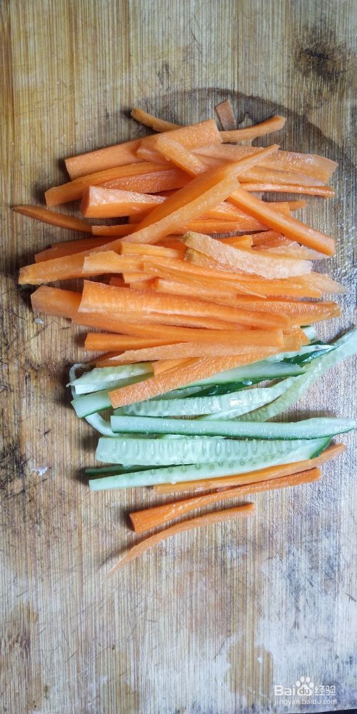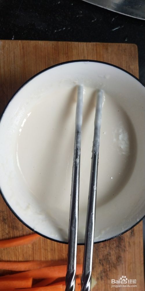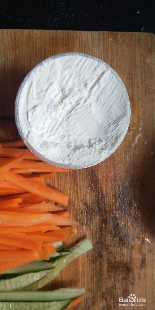 黄瓜胡萝卜切成很细的长条状,面粉准备好,加入适量水和盐调成粘稠的面浆。