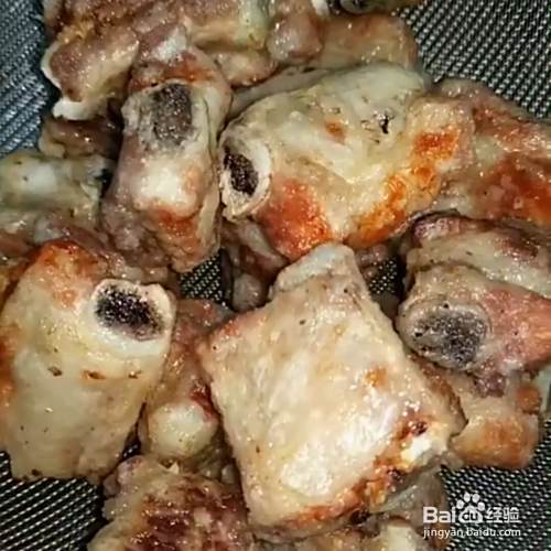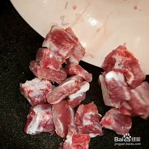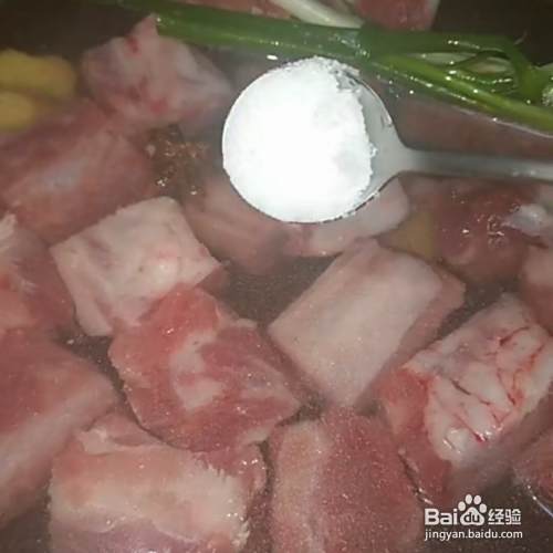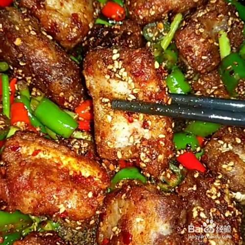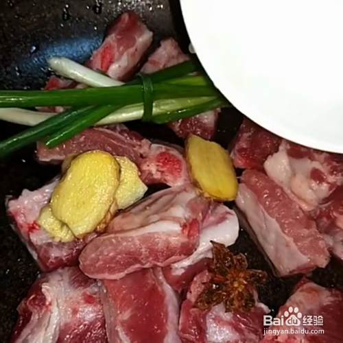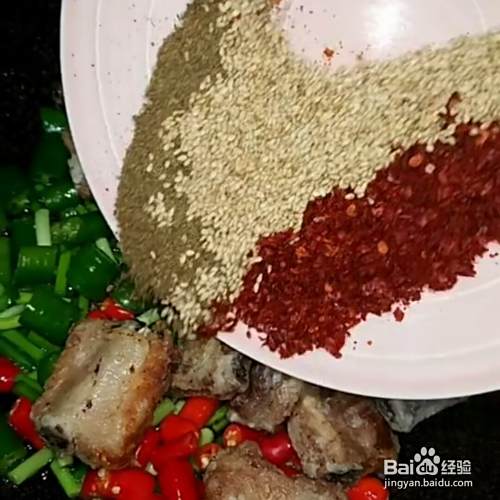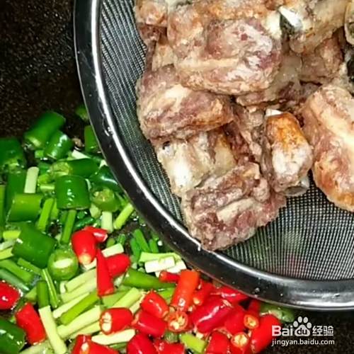 锅里留底油,倒蒜,辣椒。倒入排骨。
