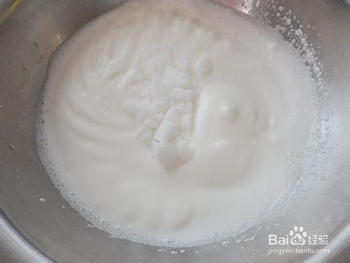 打至蛋白稍微细腻时,加入20克绵白糖。