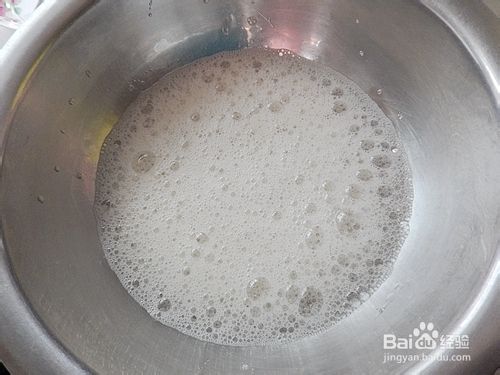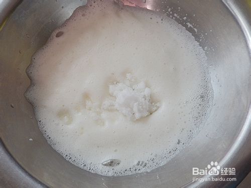 蛋白糊滴入柠檬汁打至粗泡加入20克绵白糖继续打发。