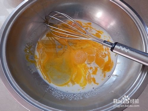 蛋黄盆中30克糖、玉米油、牛奶加入拌匀。