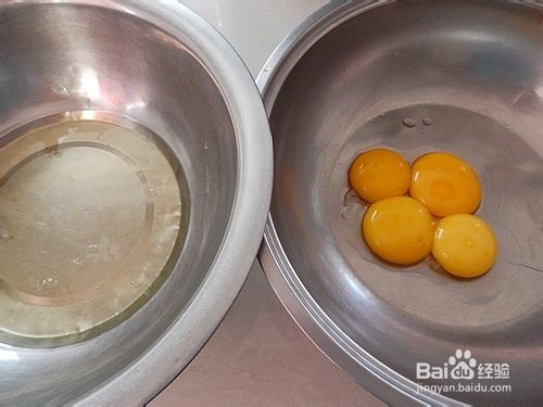把蛋黄和蛋白分离在两个无油无水的盆中。