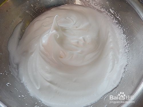 第三次蛋白打发至粗纹状,加入最后20克糖。