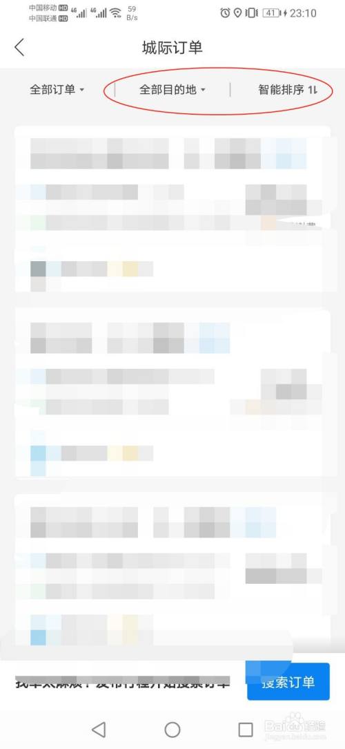第六,进入后,可以通过“全部目的地”、“智能排序”等进行筛选跨城顺风车订单。