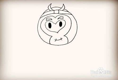 3.在爱心里面画三角形的眉毛和黑黑的眼睛,还有弯弯的嘴。