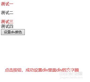 在js标签内,创建setclor()函数,在函数内,通过外部div的id和元素名称获得内部div对象,使用css()方法设置它们的文字颜色为红色。