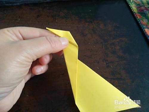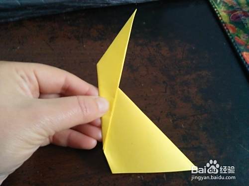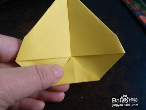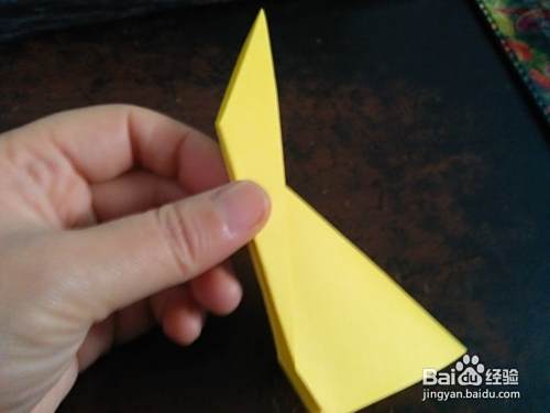 把彩纸向后从中间对折,然后再把上边的角向右折,打开后,把边向外折,如图二。