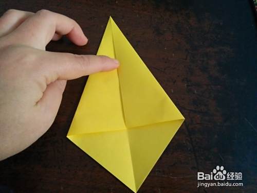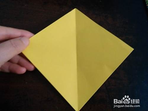 先把彩纸的对角线对折一下,再把两侧的边向内折,如图。