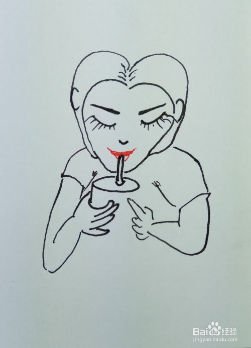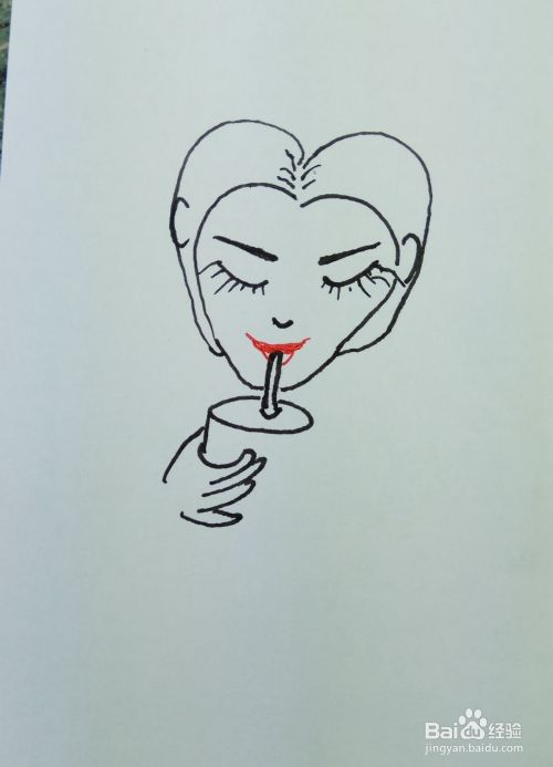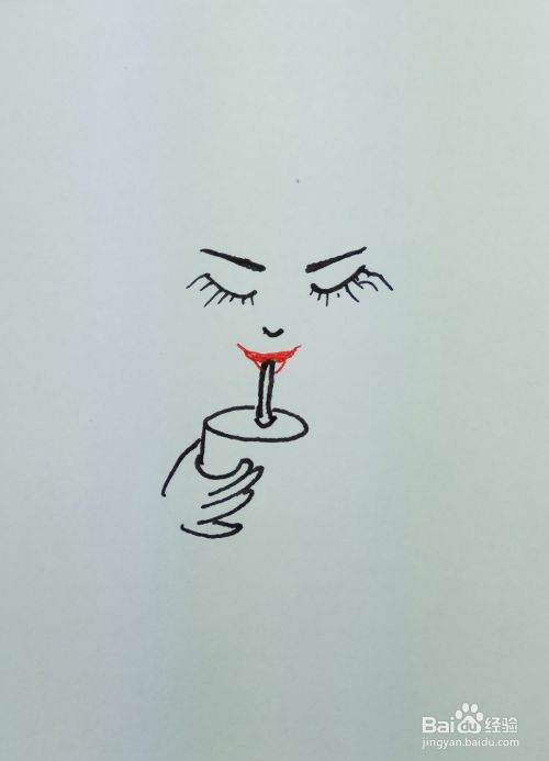 在白纸上用线条和曲线画出一个人的眼睛鼻子嘴巴,眉毛,还有他手里拿着的一个水杯,他正在喝饮料。