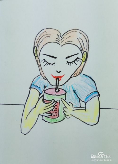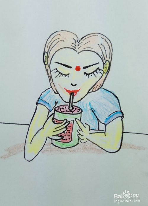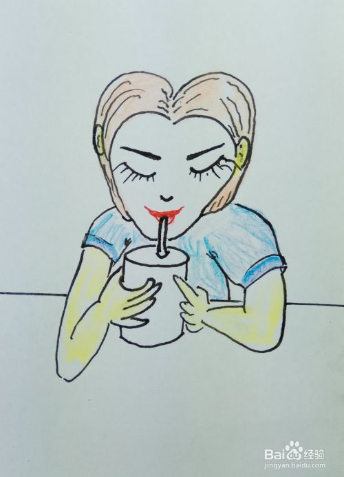 用线条画出桌面部分,并且用水彩笔涂出他的皮肤色彩,衣服色彩和头发色彩。