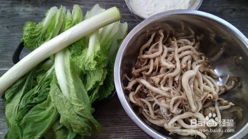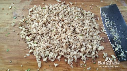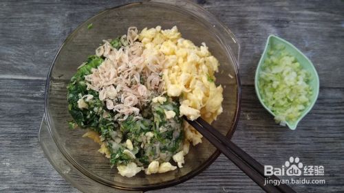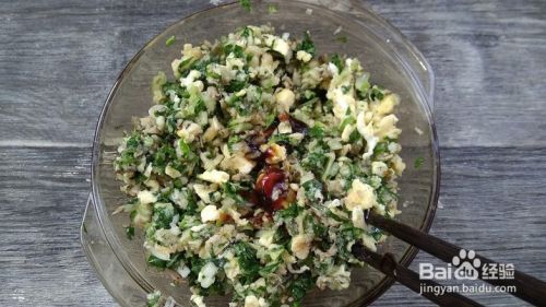 5.切碎的白菜,海鲜菇用盐杀出水分攥干水分后,加上炒好的鸡蛋,一把虾皮