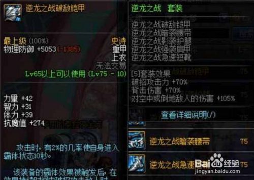 这就是75级史诗重甲装备逆龙套,我们来看看这逆龙套的属性,可以看到,这逆龙套套装属性比较爆炸,破招攻击力+70%,背击伤害+70%,对空中或倒地的敌人伤害+105%。