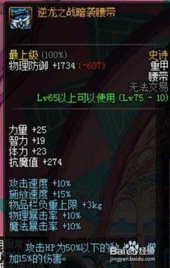 逆龙套的头肩,这加成攻速10%,施放速度15%,物爆和魔爆10%,而且攻击HP50%以上的敌人时,可以增加15%的伤害。这头肩不仅能加攻速,还能加伤害,这在游戏中都不多见。逆龙套腰带,这腰带的属性和头肩的属性相同,都是加攻速和伤害,不一样的是,这腰带攻击50%一下血量的敌人增加15%的伤害。