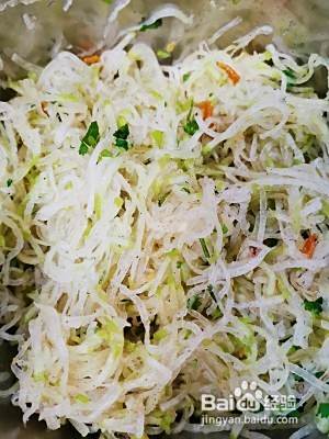 青萝卜切丝,放少许食盐腌10分钟,挤水。拌入葱末,姜末。虾皮和少许葱姜末炒一下,也拌入。最后放少许蚝油,生抽,五香粉,食盐调味。