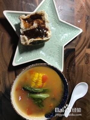 因为有碳水了,就用之前熬的骨头汤煮了番茄和生菜。早餐就准备好了!