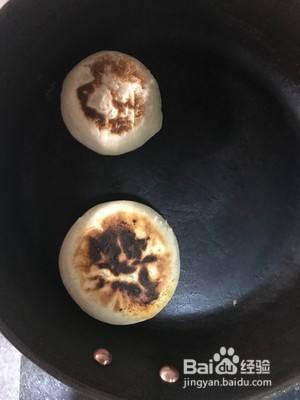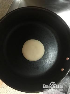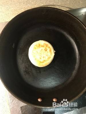 轻轻地压扁包好馅儿的面团。我的是铁锅,烧热,不放油。把压扁的面团放进去。小火,一定开小火,慢慢烙。