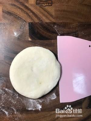 取一个面团,用手压扁。面团中心位置稍微厚余边缘位置。