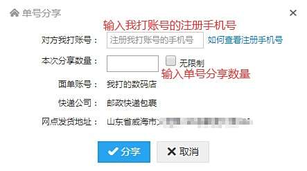 在弹出窗口中,输入对方我打账号的注册手机号,以及要分享单号数量;