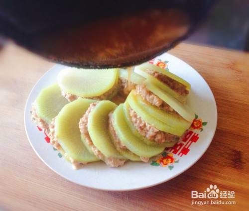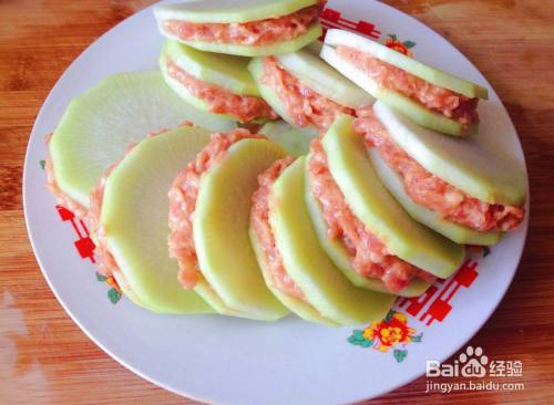 萝卜肉夹这道菜做法非常简单,先将肉馅调味拌匀,再把萝卜去皮后切成薄厚均匀的萝卜夹,然后将肉馅填到萝卜夹中上锅蒸熟,最后出锅再勾个芡汁即可。