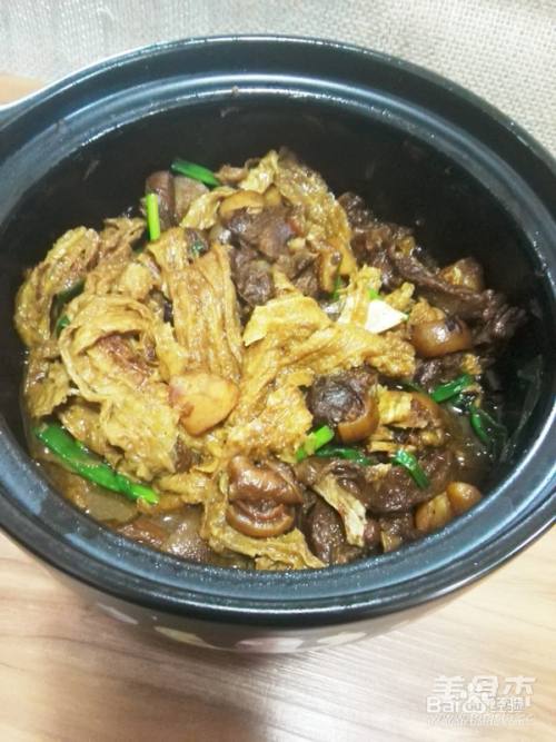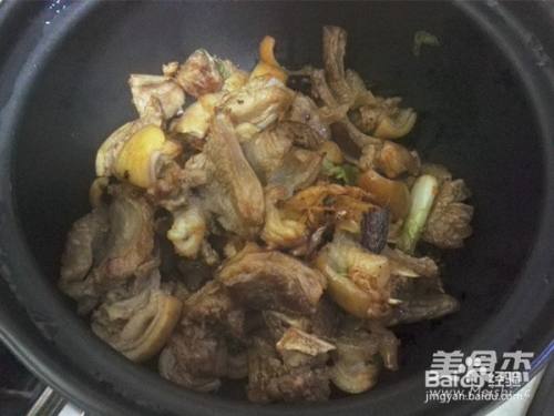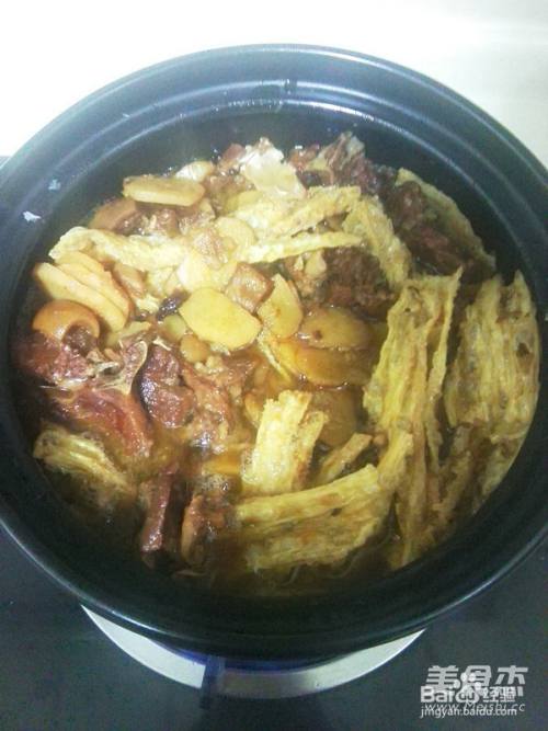 11把压好的羊腩放进煲中,放入炸腐竹
