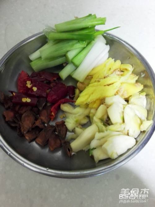 3准备好八角、干辣椒、香葱段、蒜子和姜末