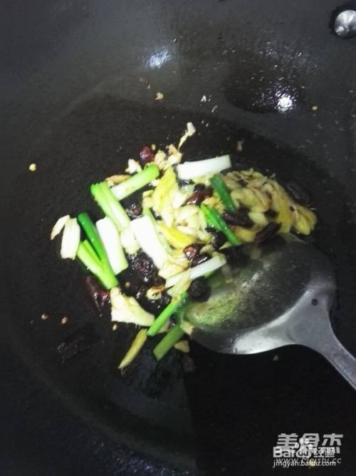4热锅下油,先把八角、干辣椒、蒜子和姜末放进去爆香,再放入香葱段