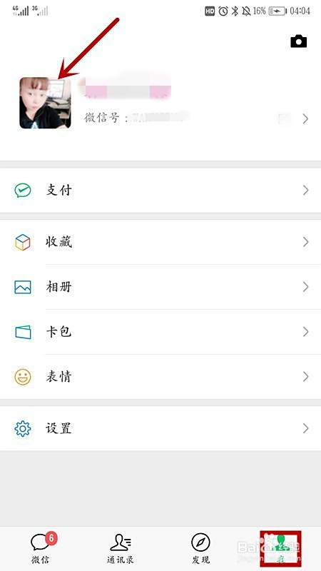 首先打开微信主页,点击右下角的我,再点击自己的微信头像,如下图。