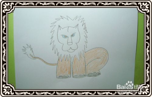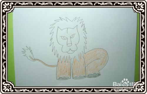 接着,用黑色的彩铅笔画出狮子的身体和长长的尾巴出来,如下图所示。
