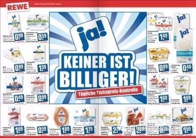 所有超市里面都有一些价格统一便宜到吐血的生活必需品,比如说1L全脂牛奶都是0.65,半脂0.59, 酸奶一小盒0.29,1kg405面粉0.49, 1kg白砂糖0.89,10个鸡蛋1.29,4卷厨房用纸1.35…这些东西,到哪个超市都是统一价格,只是牌子不一样。这些生活必需品是常年不涨价的,几十年如一日,前一段时间牛奶涨价几分钱德国媒体还大惊小怪了好半天。当然如果想要好一点的也有,比如牛奶就有1欧以上的高级好喝一点的,面粉也是有高级一点的牌子,超市的价位高低,通常就体现在这些高级一点的东西上。