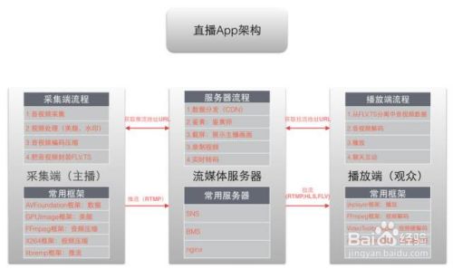 直播环节:推流端(采集、美颜处理、编码、推流)、服务端处理(转码、录制、截图、鉴黄)、播放器(拉流、解码、渲染)、互动系统(聊天室、礼物系统、赞)