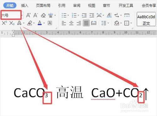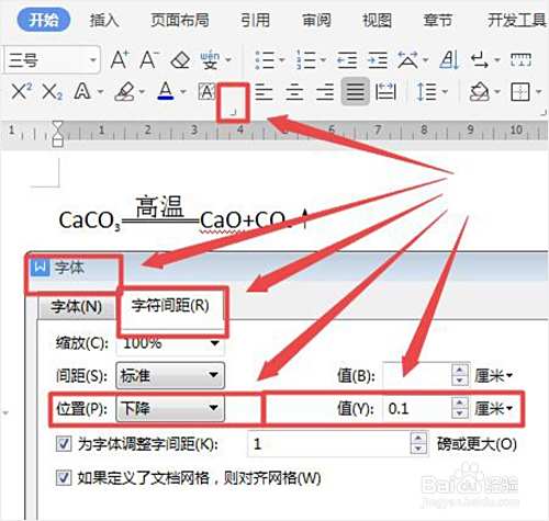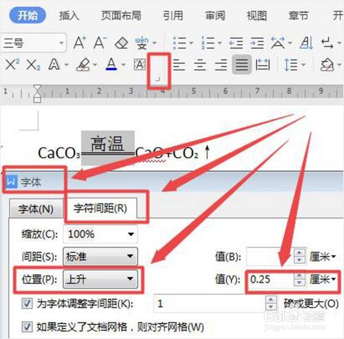 对“高温”再次选择,点击“开始”,在“开始”右下方找到一个直角符号,点击拉开“字体”调整窗口,选择“字符间距”、“位置”选择“上升”,后面数值0.25厘米,化学反应分子式基本成型。