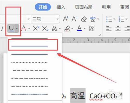 对“高温”二字进行选择,点击左上方“开始”,在“开始”下面找到“下划线符号”打开对话框,选择双线。