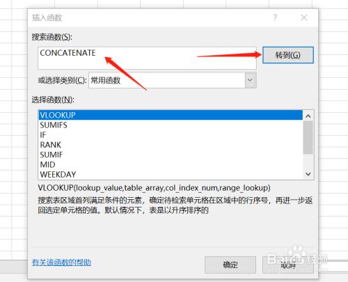 在【搜索函数】中输入CONCATENATE,并【转到】-【确定】