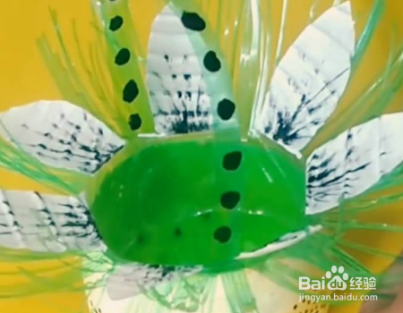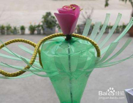 将塑料瓶的三分之一减掉,下面部分留用,沿着瓶身竖着剪成宽窄一样的条形,再将这些条形像编花篮一样编好一圈,这样一个好看的花瓶就做好啦。