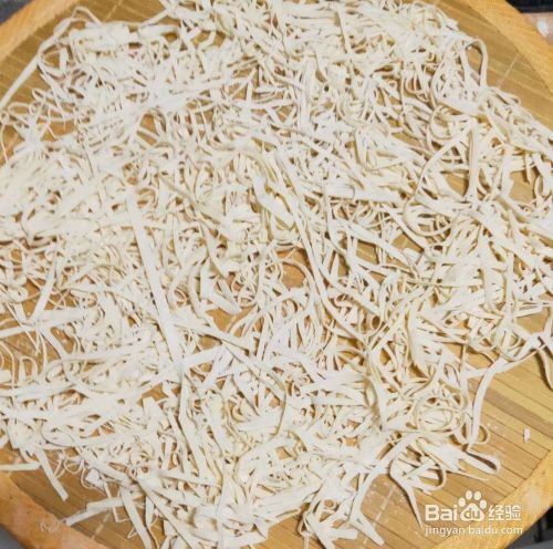 然后把切好的面条,适量地松开,这时面条已经成行了。为了防止粘连可以在撒些面粉,如图所示。