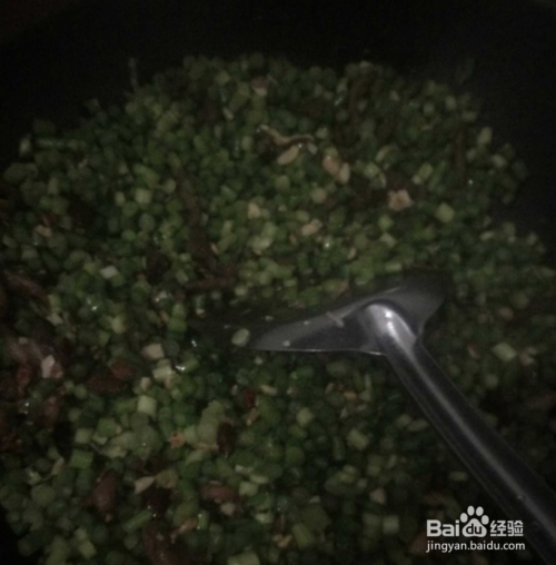 倒入蒜台,可以改中火,倒入盐,和味精调味,炒两三分钟可以了
